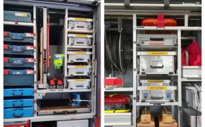 駕駛室頂部前端為長排警燈,車身后配有24V/60W火場照明燈一只,車輛兩側(cè)上方各配有紅藍(lán)相配的爆閃燈,下方安裝安全標(biāo)志燈,乘員室、器材箱、 泵房內(nèi)均裝有照明燈,加裝有100W警報器,回轉(zhuǎn)警燈開關(guān)、通訊設(shè)備預(yù)備接口。